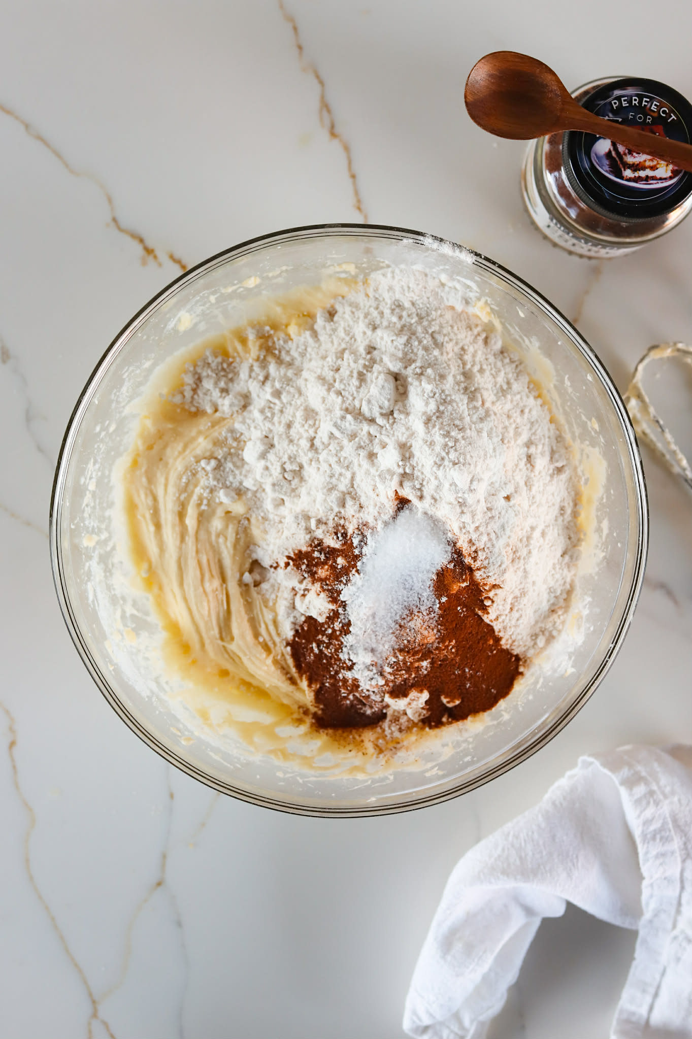 - Add 200 grams of all purpose flour, 5 grams of espresso powder, 1/2 teaspoon of baking powder and 1/2 teaspoon of salt and mix until just combined