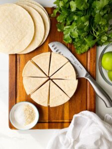 - Cut corn tortillas into equal wedges