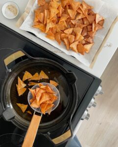 Be sure to wait until the oil is hot enough before you start adding your tortilla wedges. The ideal chip frying temperature is right around 350 degrees, but you can also test the oil by grabbing a tiny piece of tortilla and dropping it into the oil. As soon as the oil begins to sizzle right when you drop the tortilla in, the oil is hot enough to start frying your chips.