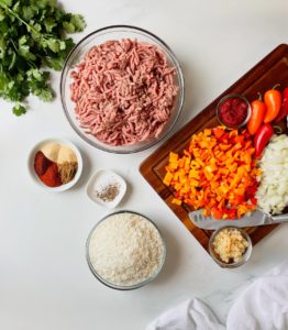 Begin by gathering 16 ounces of ground turkey, a large onion, some sweet bell pepper, garlic, spices and fresh cilantro. I am using white rice today, but feel free to use brown or wild rice if you prefer.