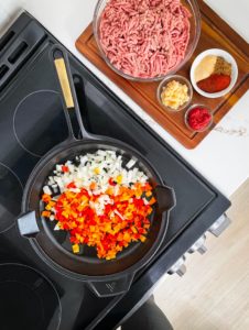 Place a large skillet over medium heat, add a splash of olive oil and your diced onion and sweet bell peppers. Season the onions and peppers with salt and black pepper and cook for 6-8 minutes or until softened.