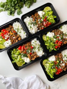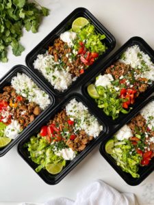 Once everything has cooled, add your rice, shredded lettuce and turkey mixture into your airtight meal prepping containers.