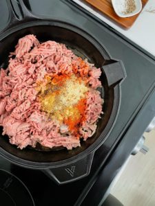 - Add 16 ounces of ground turkey into the skillet and season with tomato paste, garlic powder, onion powder, cumin, paprika and chili powder