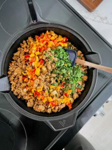 For the seasoning, I am using a blend of garlic powder, onion powder, cumin, paprika and chili powder, but feel free to substitute your favorite taco seasoning or add some cayenne, if you want your turkey fajita rice bowl to have a little kick.