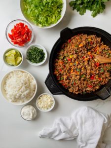 - Add rice and shredded lettuce into bowls and top with the ground turkey mixture
