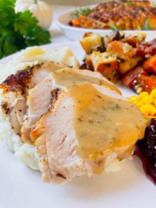 This gravy is amazing. Straining the drippings keeps it smooth and the roux (the butter and flour mixture) thickens it beautifully. The parsley adds a beautiful fresh note and then all of the seasoning that you rubbed your turkey down with helps bring so many delicious flavors into this gravy.