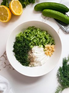 - Add the shredded cucumber into a large bowl and add the greek yogurt, minced garlic, dill, mint (if using), lemon juice, olive oil, salt and pepper in a medium bowl