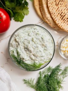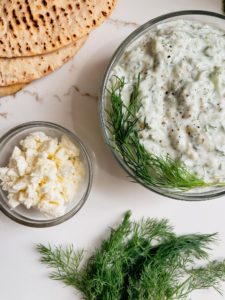 To the cucumber, add 1 1/4 cup of plain full fat greek yogurt with 1/4 cup of finely chopped fresh dill, a tablespoon of extra virgin olive oil, a finely minced garlic clove, a small pinch of black pepper, a big pinch of salt and a tablespoon or so of very finely chopped mint, if using. Mix to combine.