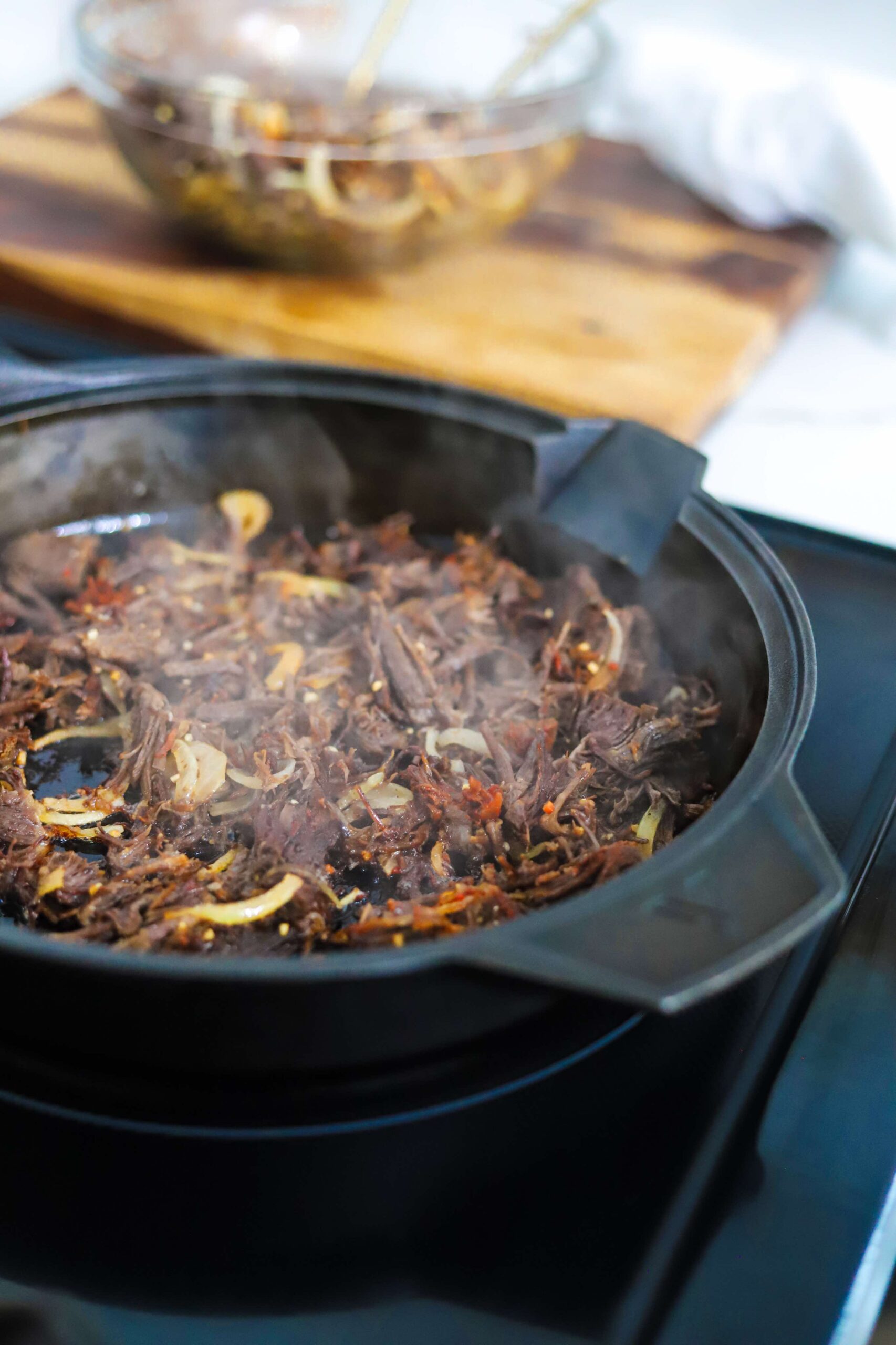 Once the skillet is warm, add a thin layer of the marinated beef and onions and press it down into the bottom of the skillet a bit. Let the beef and onions sear until the get nice and crispy. Flip the beef and onions and let the other side get crisp before transferring it onto a plate and repeating the process with the rest.