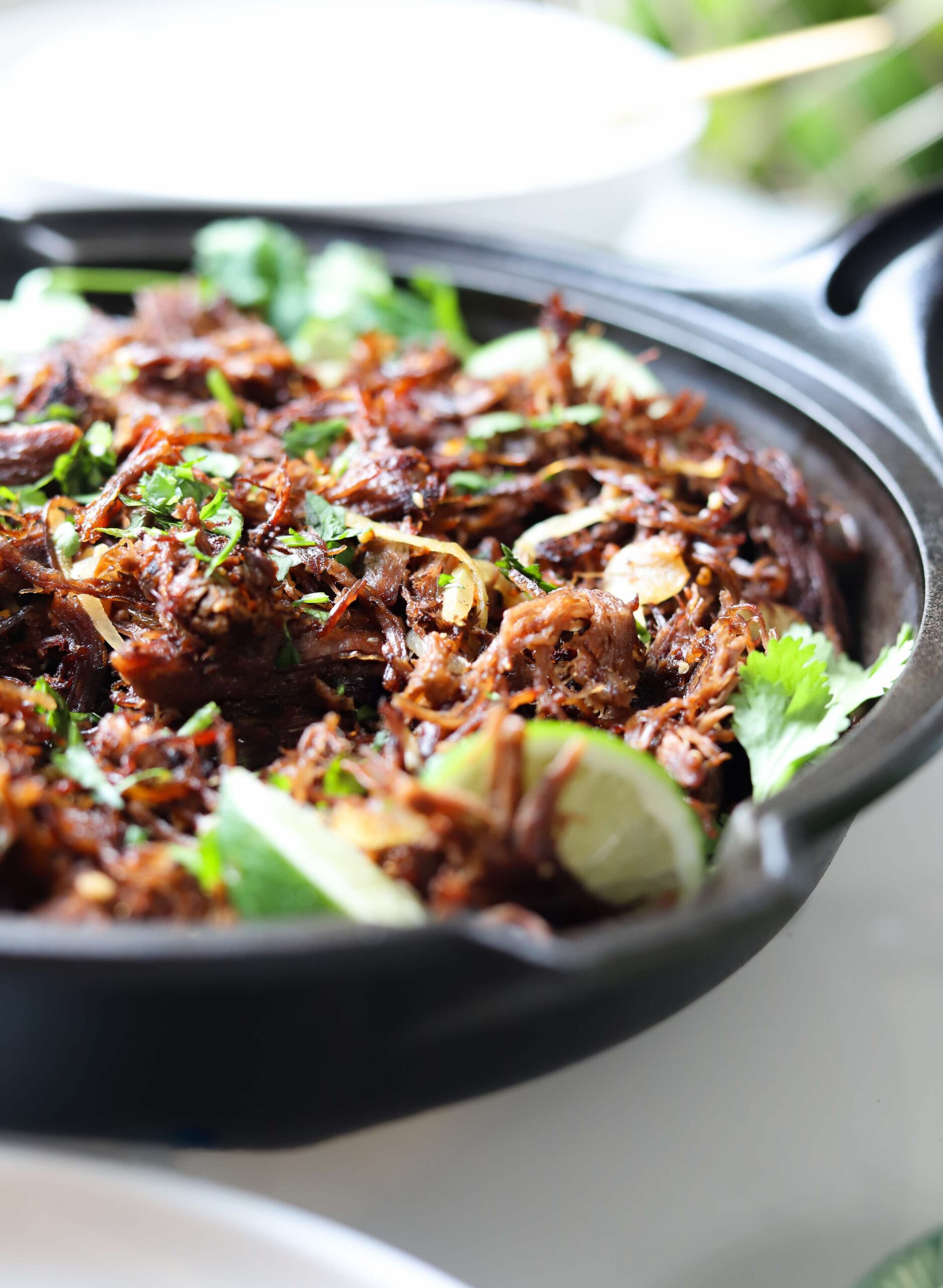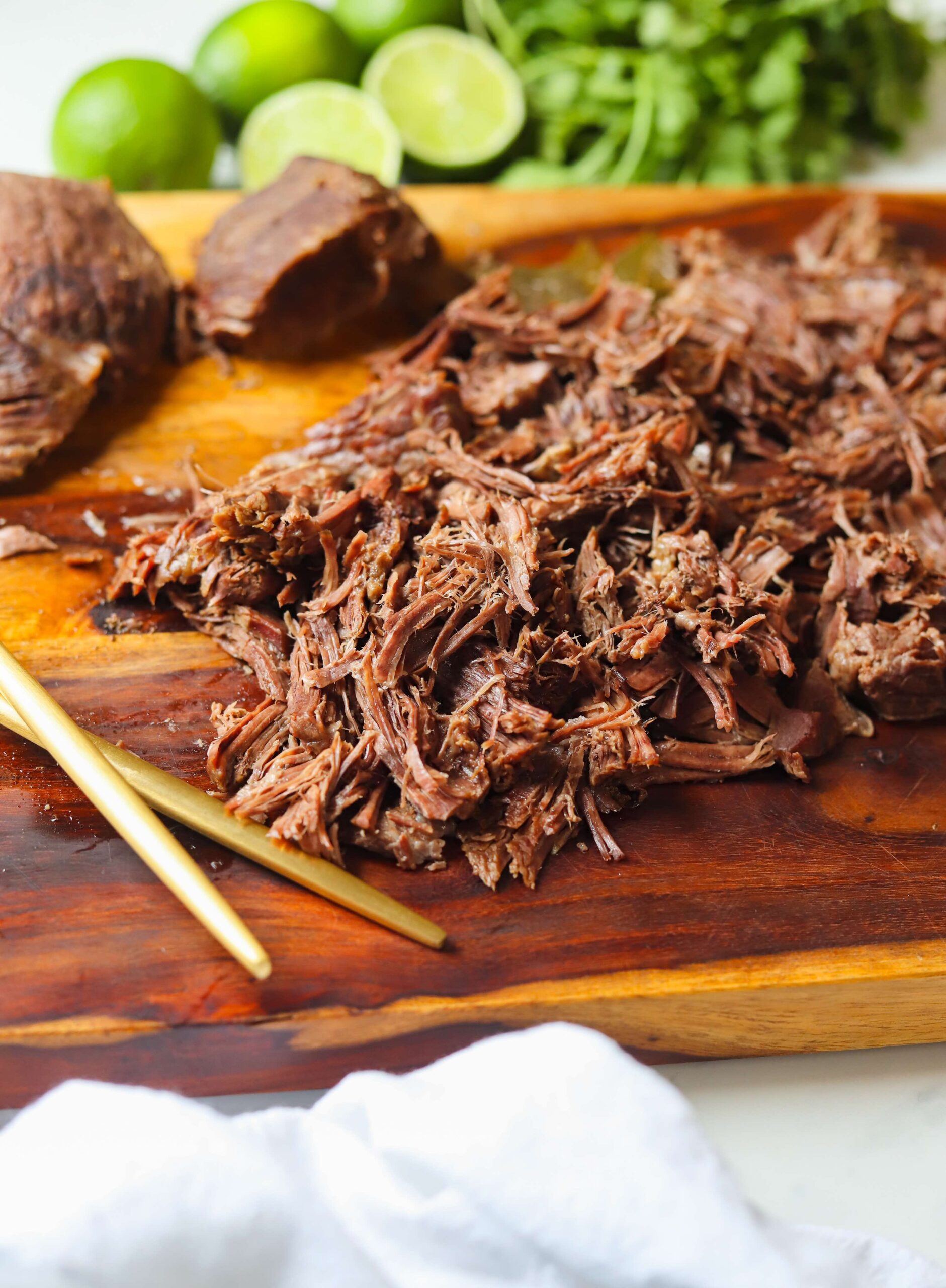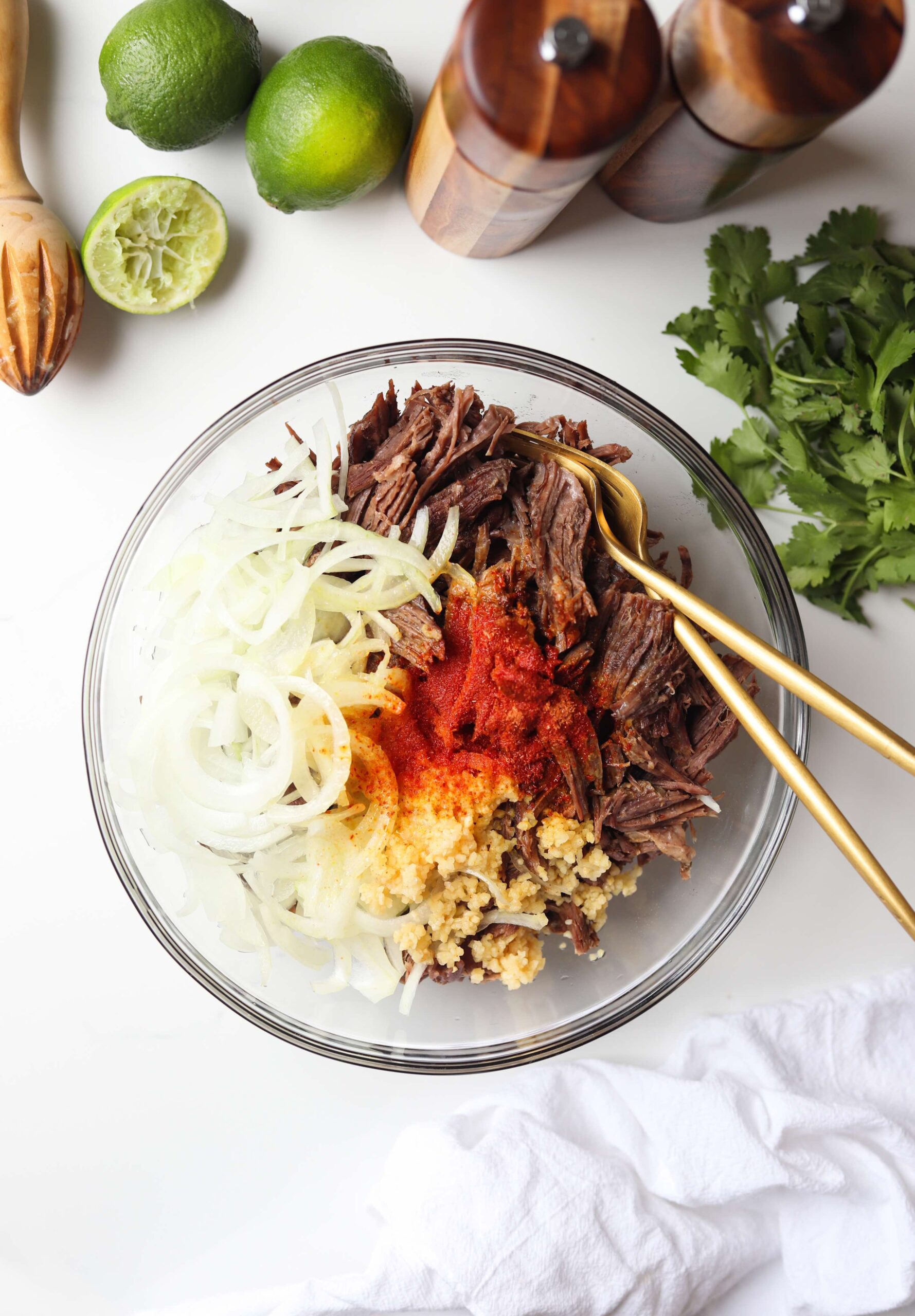 Add a large thinly sliced yellow onion, 1/3 cup of fresh lime juice, 1/4 cup of neutral oil, 4 large finely minced cloves of garlic, a tablespoon of sazon seasoning, a teaspoon of salt and 1/4 teaspoon of black pepper in with the shredded beef and mix until everything is evenly distributed.