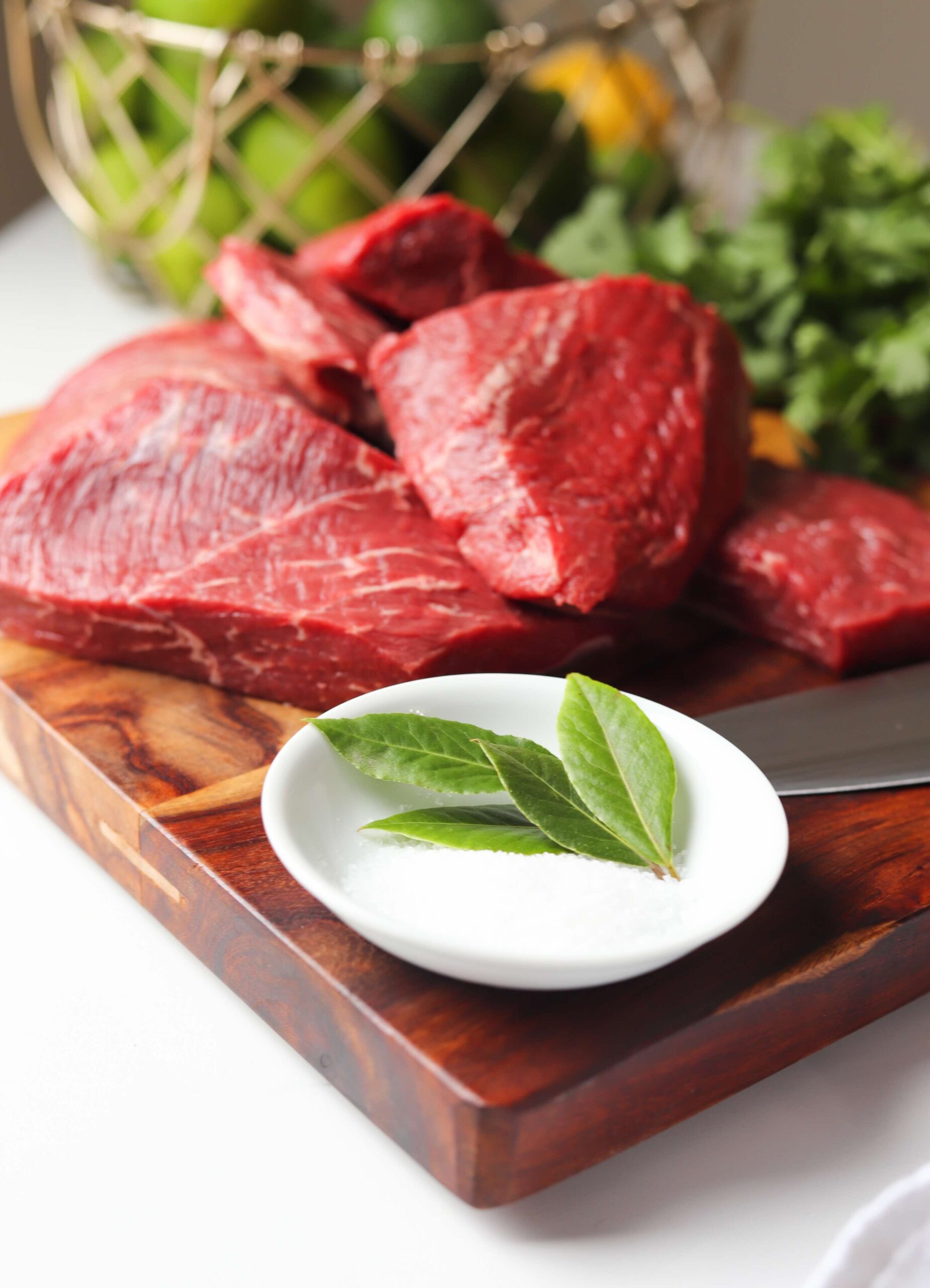 - Add 3 bay leaves, 1 1/2 teaspoons of salt and enough water to completely cover the flank steak