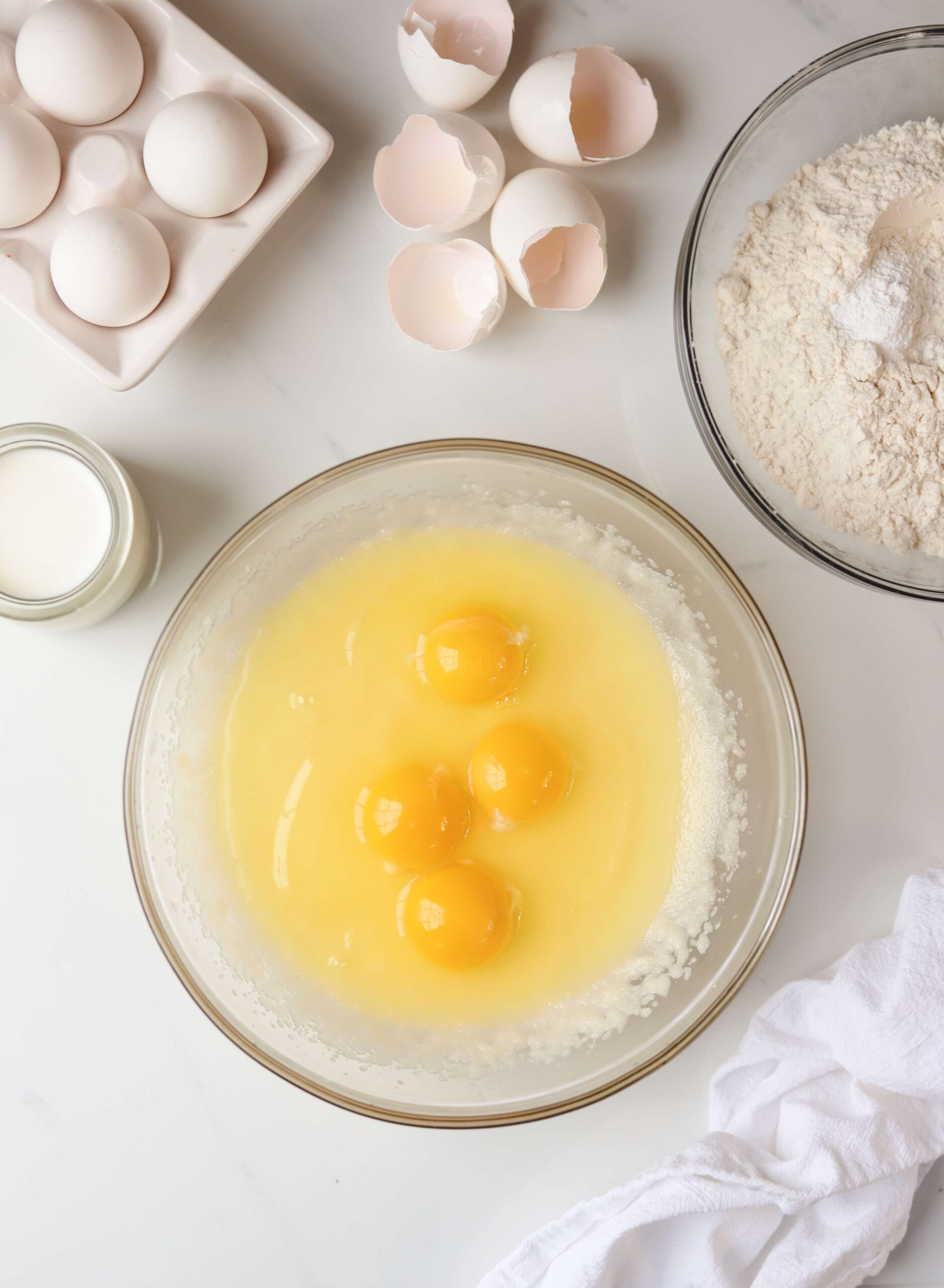 Add 1 1/3 cups of granulated sugar and beat until the mixture develops a pale yellow color and the sugar looks well incorporated.