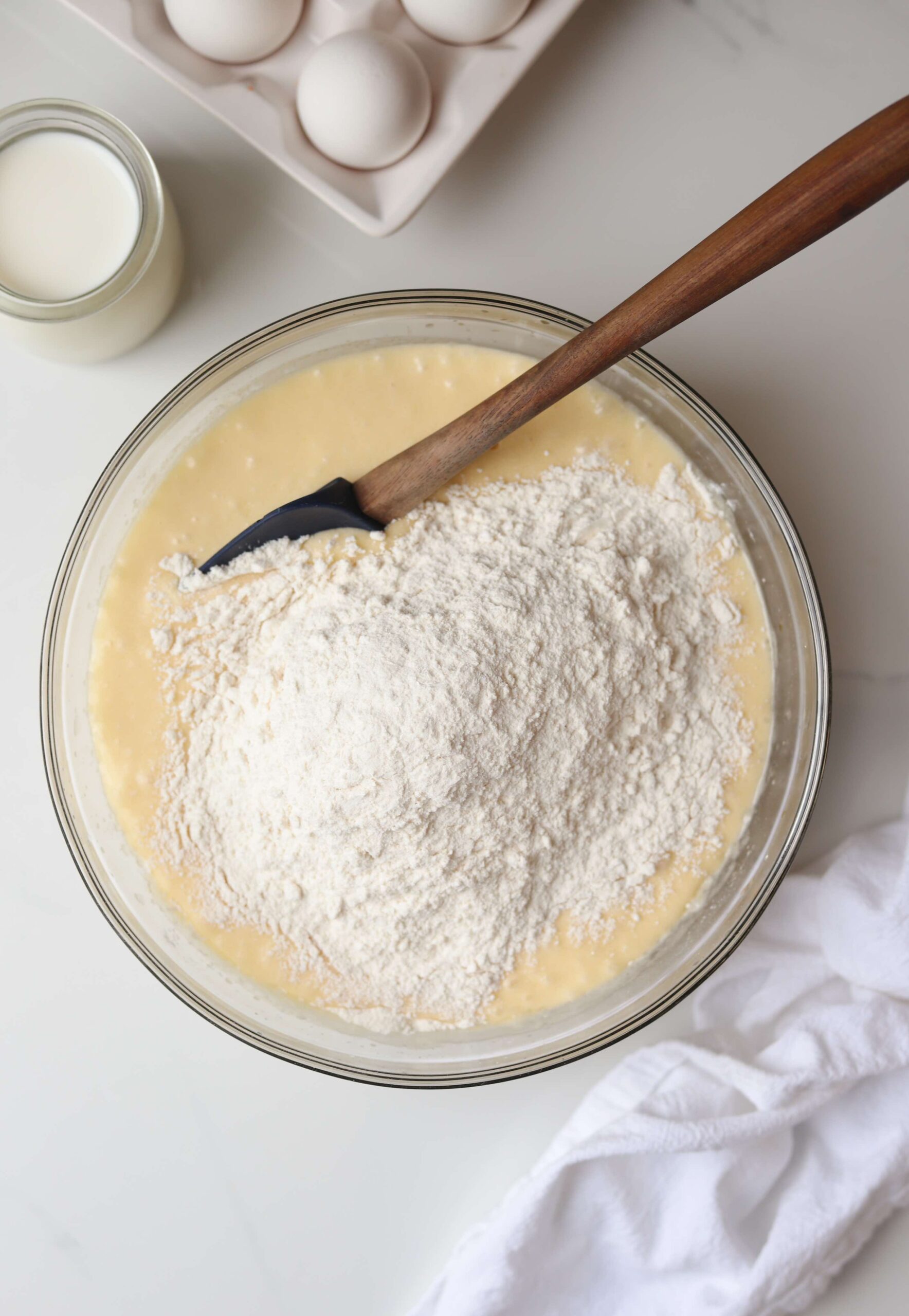 Last, but not least, add 1 1/4 cups of whole milk and gently stir until the batter fully comes together. Some lumps are perfectly fine here! If you mix the batter enough to get rid of all of the lumps, it will be over mixed, so stop mixing once the milk is evenly distributed.
