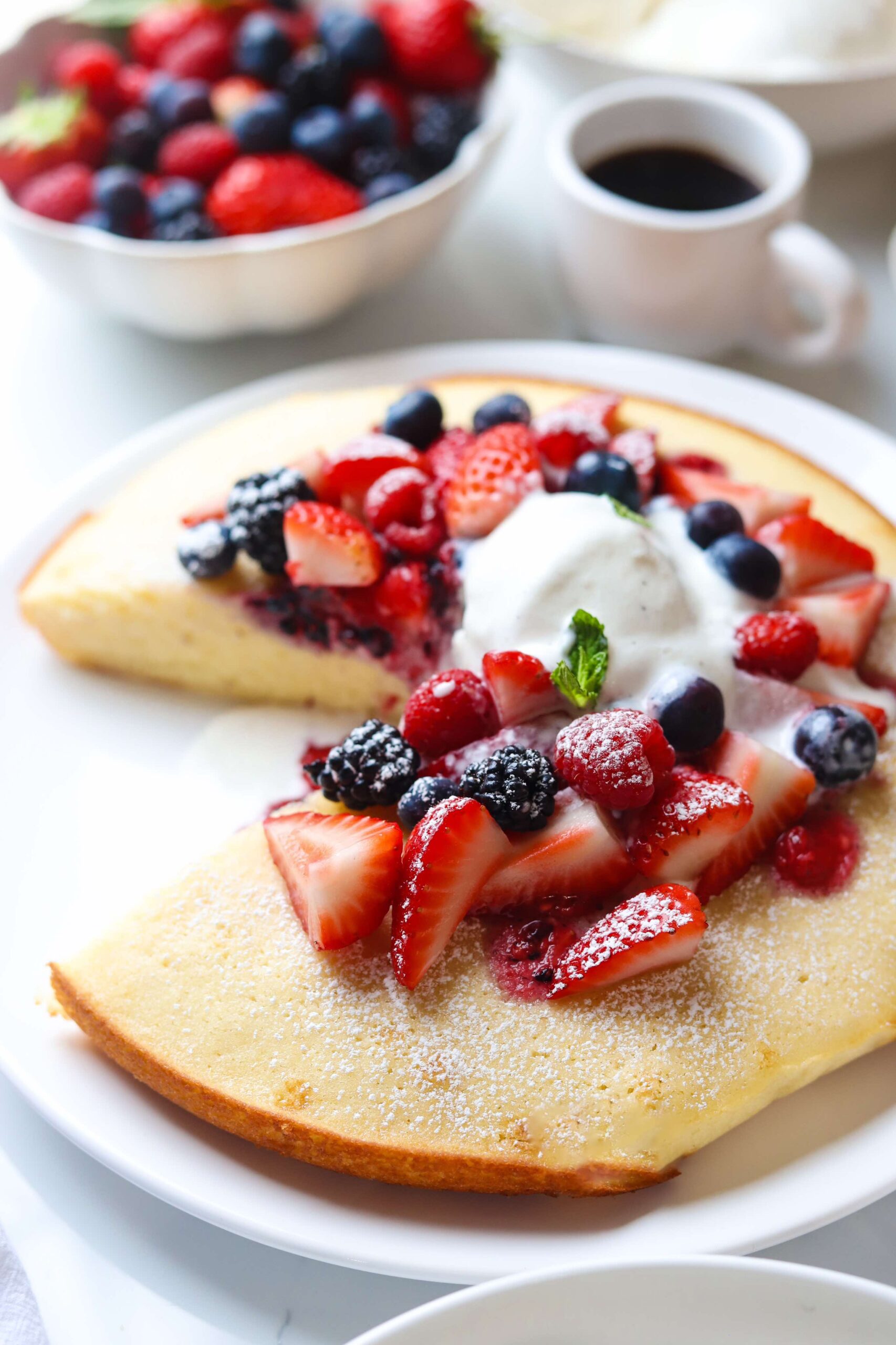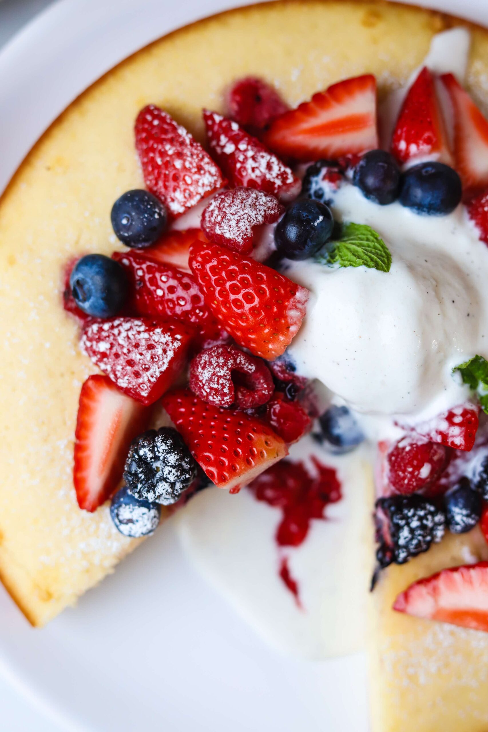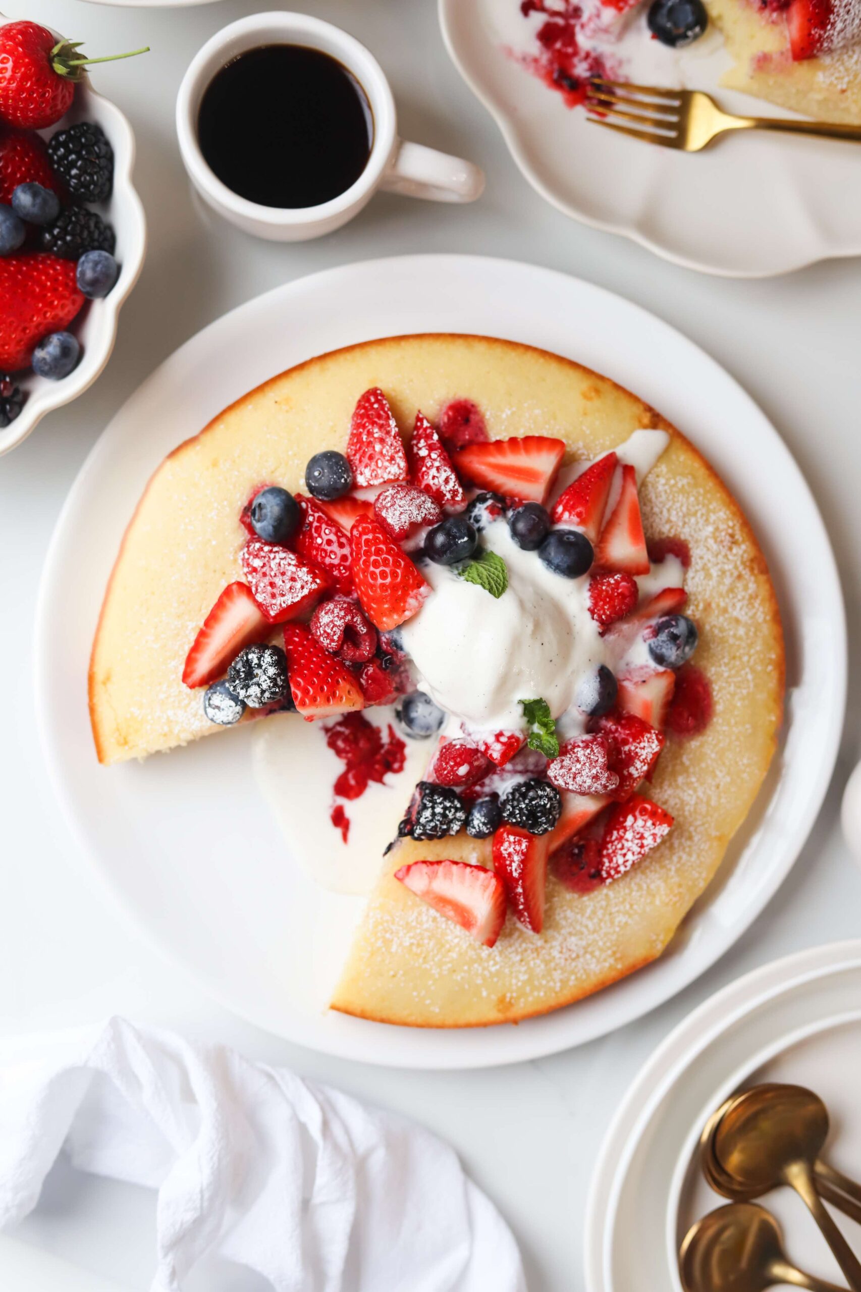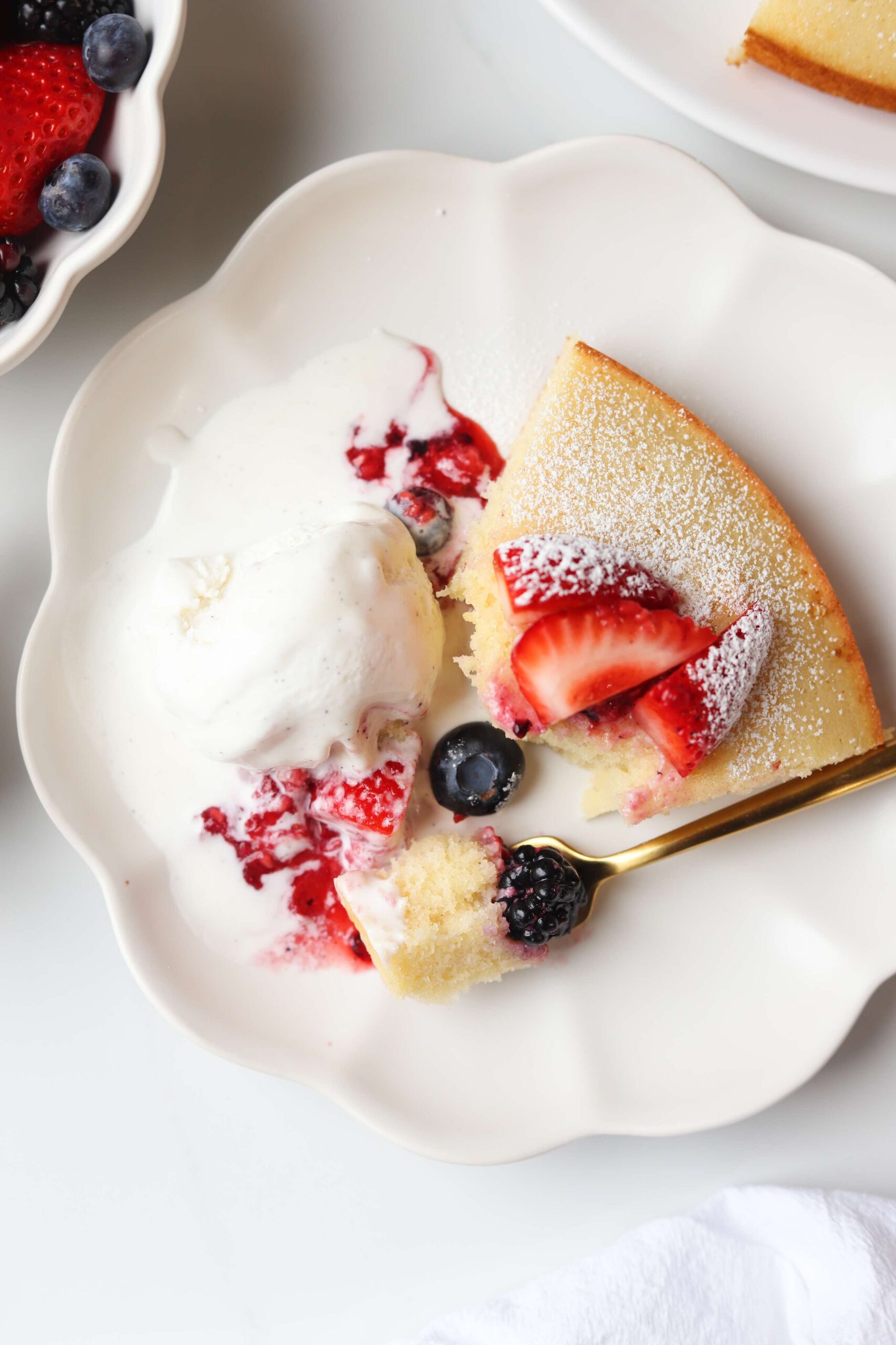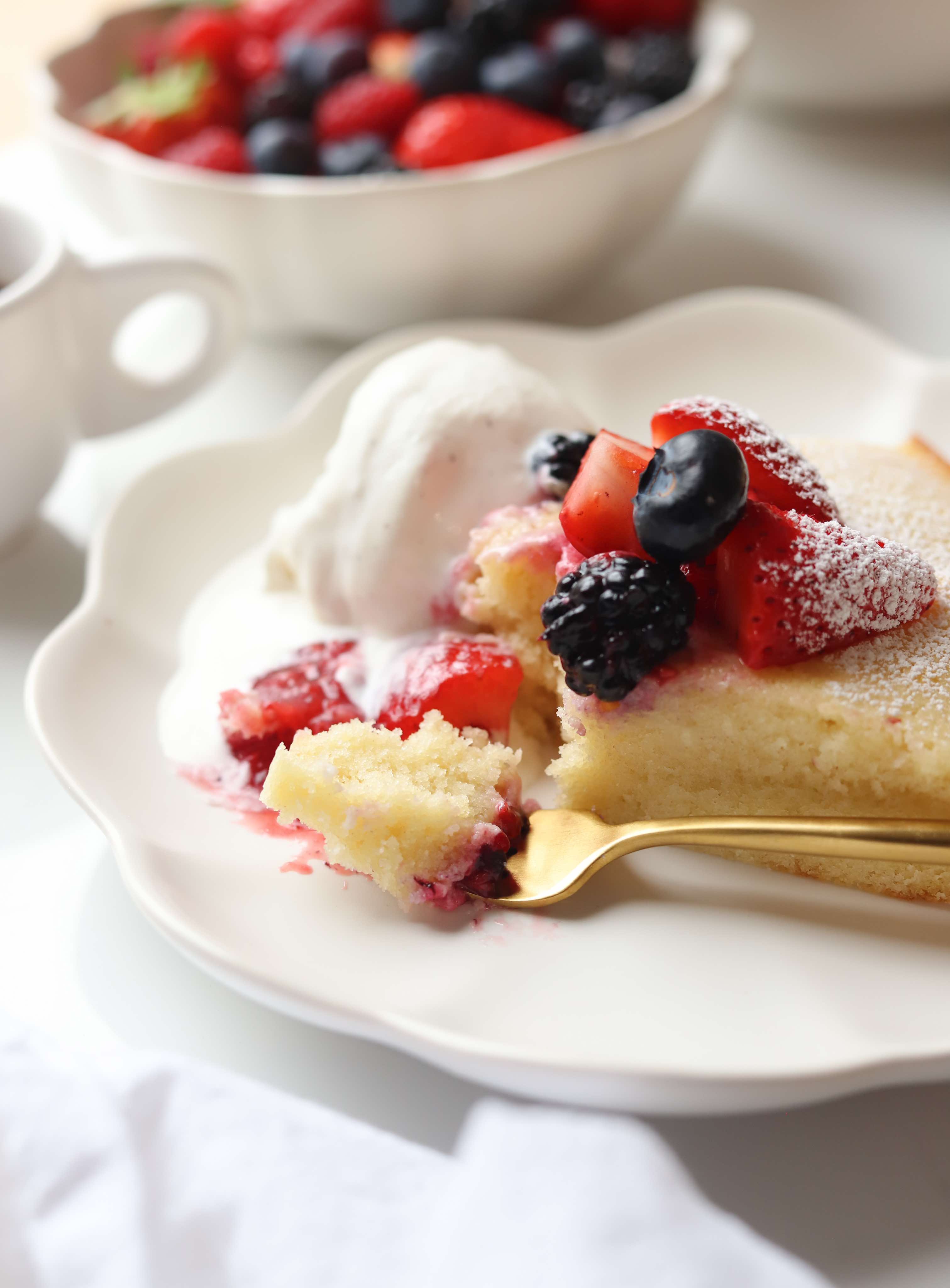 This vanilla cake is full of beautiful flavor and it pairs so perfectly with the fruit. The places where the cake soaks up the juices from the fruit is the best part, so be sure to spread those berries out over your whole slice. You may even want to double the amount of berries just to be sure you have plenty on hand.