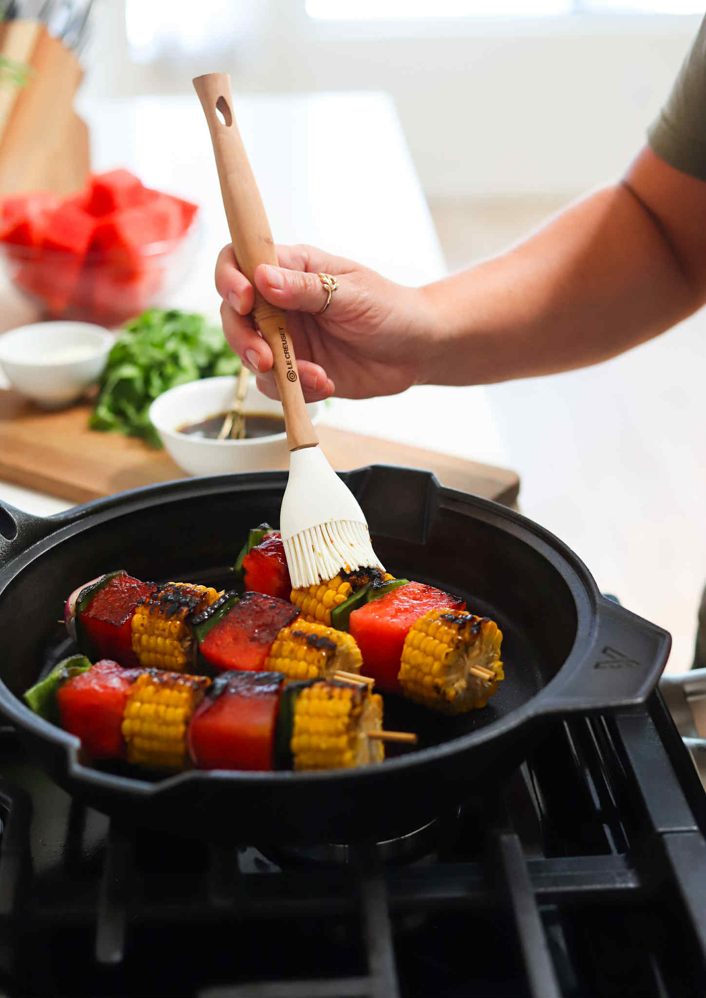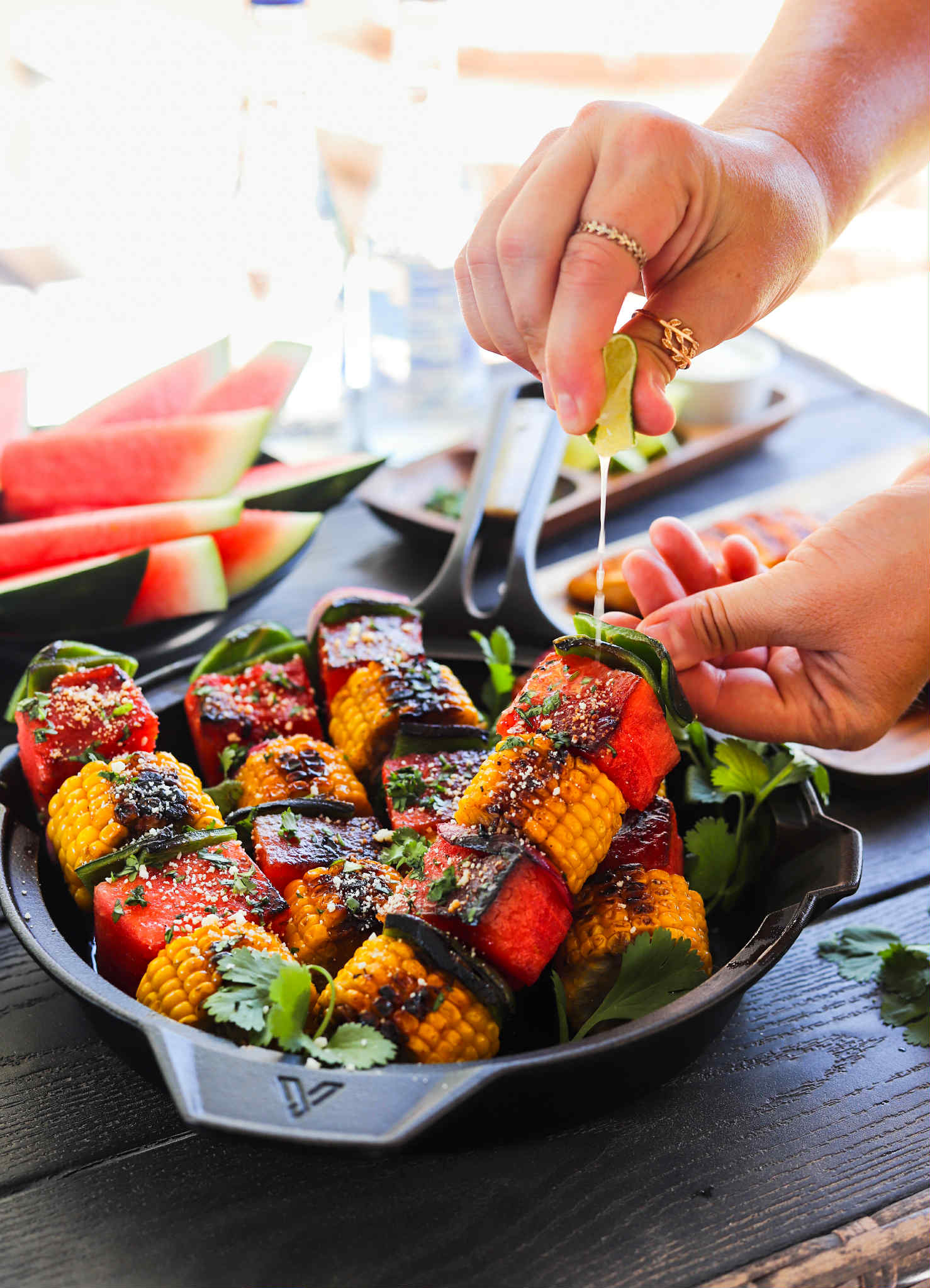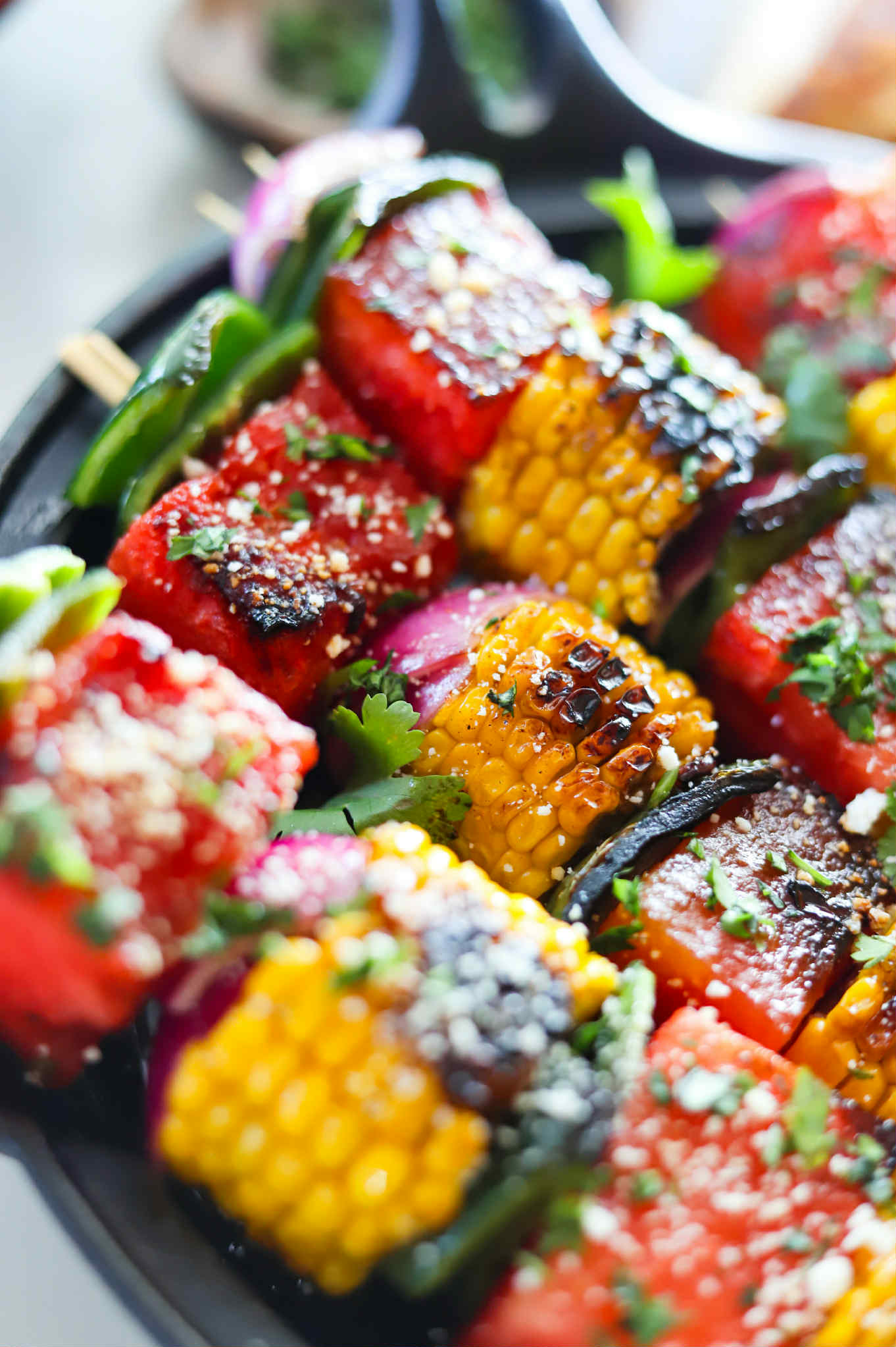 These skewers are so fabulous. The sweet corn and poblanos charred with that sweet and salty glaze are a thing of beauty, but the watermelon is the real star of the show.