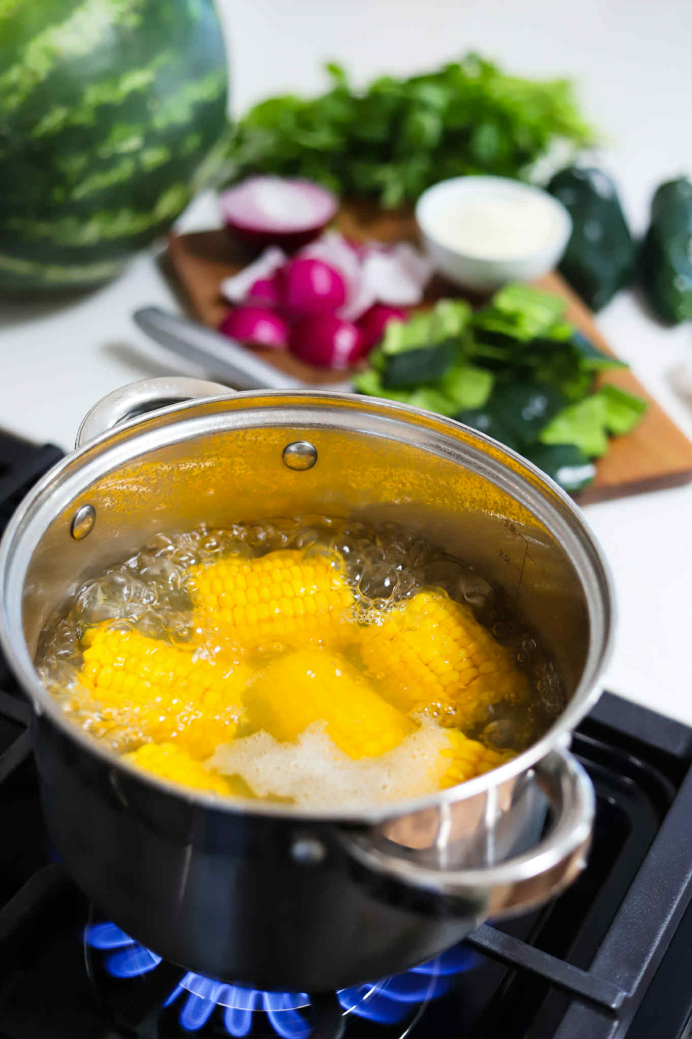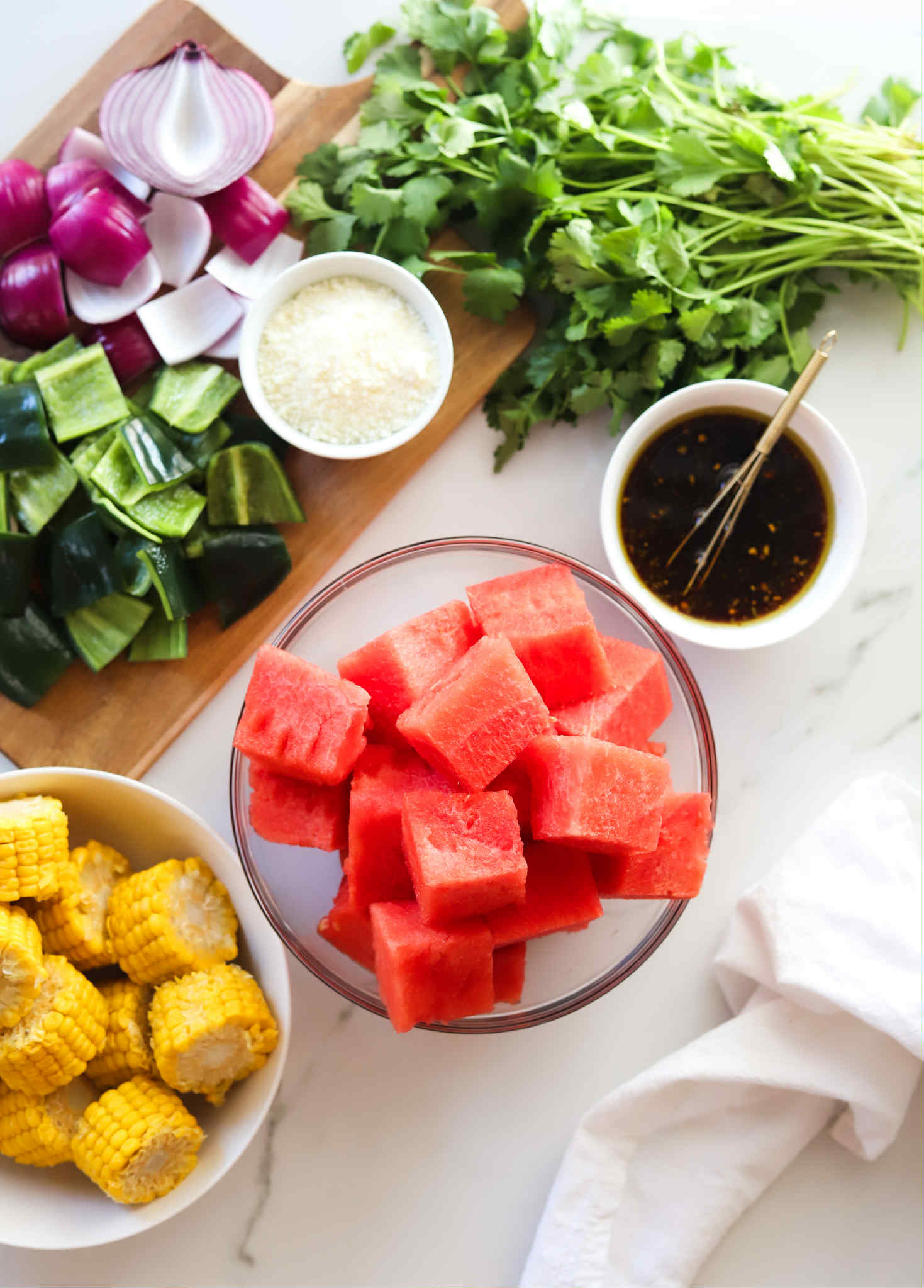 In addition to the corn, we will need a medium seedless watermelon cut into chunks the same thickness as the corn cobs, some sliced poblanos and red onion. If you can’t find poblanos, feel free to use sweet bell peppers and if you don’t like red onions, sweet onions can be used instead.