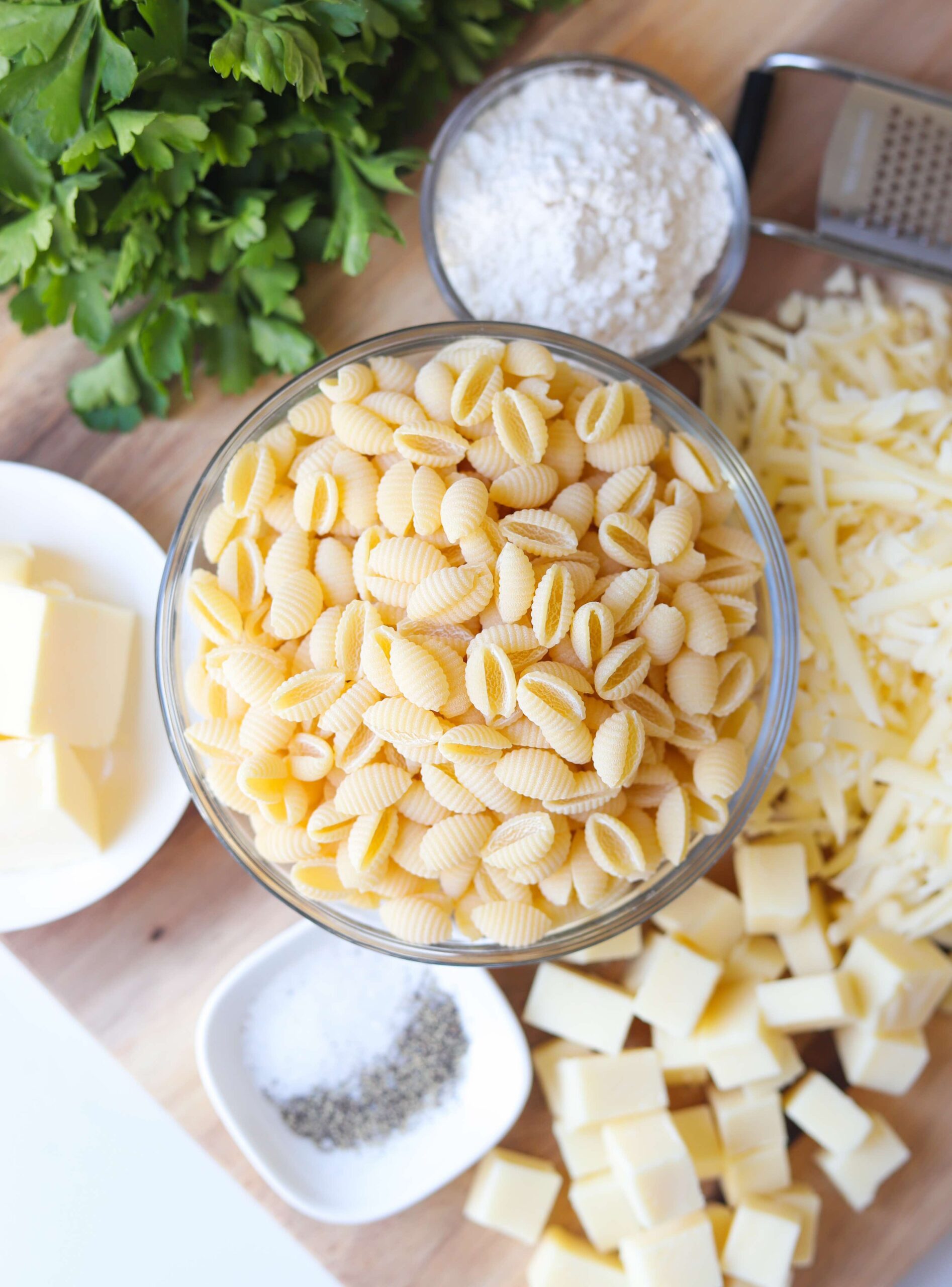 For the best results, buy both cheeses in block form and shred your white cheddar by hand and cut your white American into cubes. American cheese is too soft to easily shred, so cubes are fine!