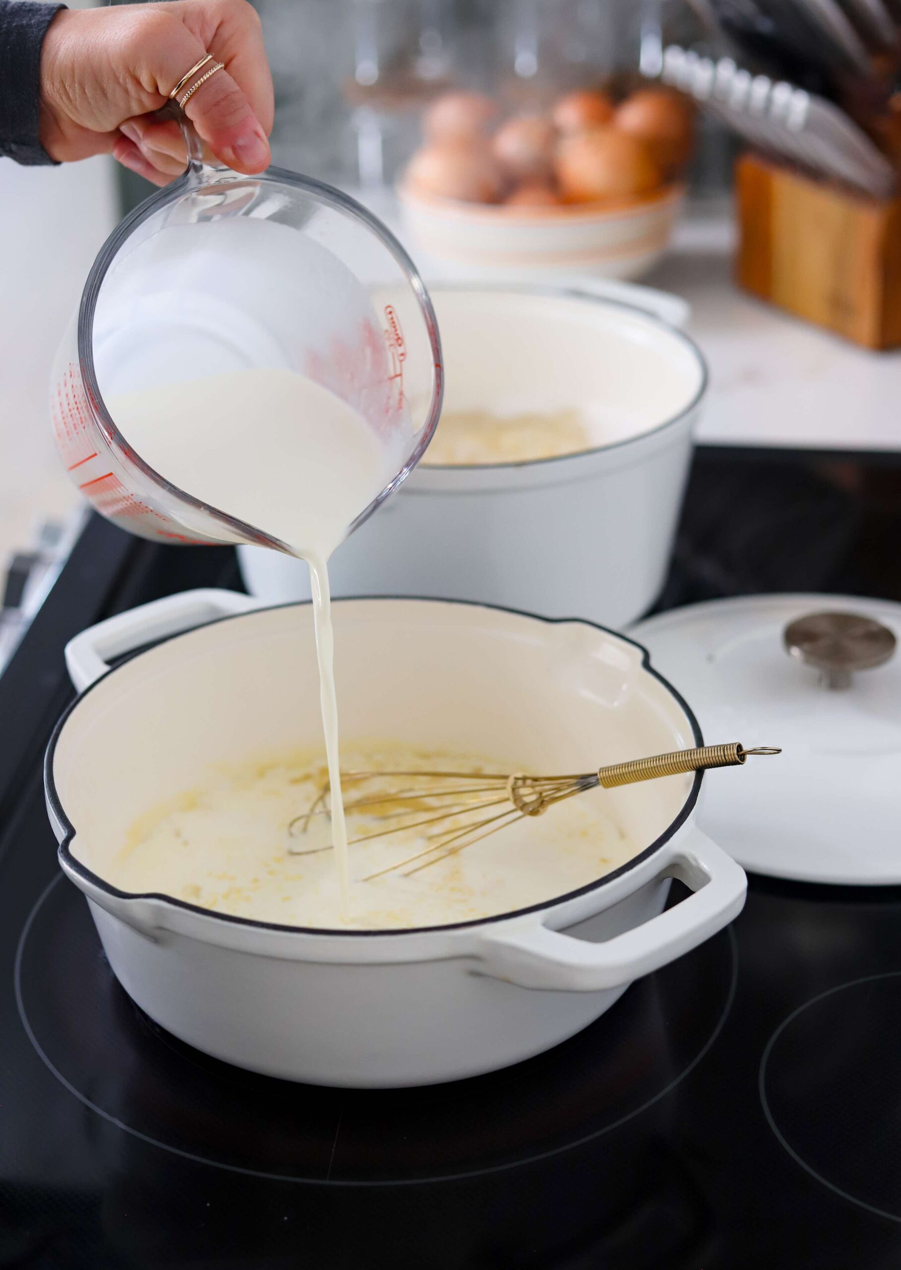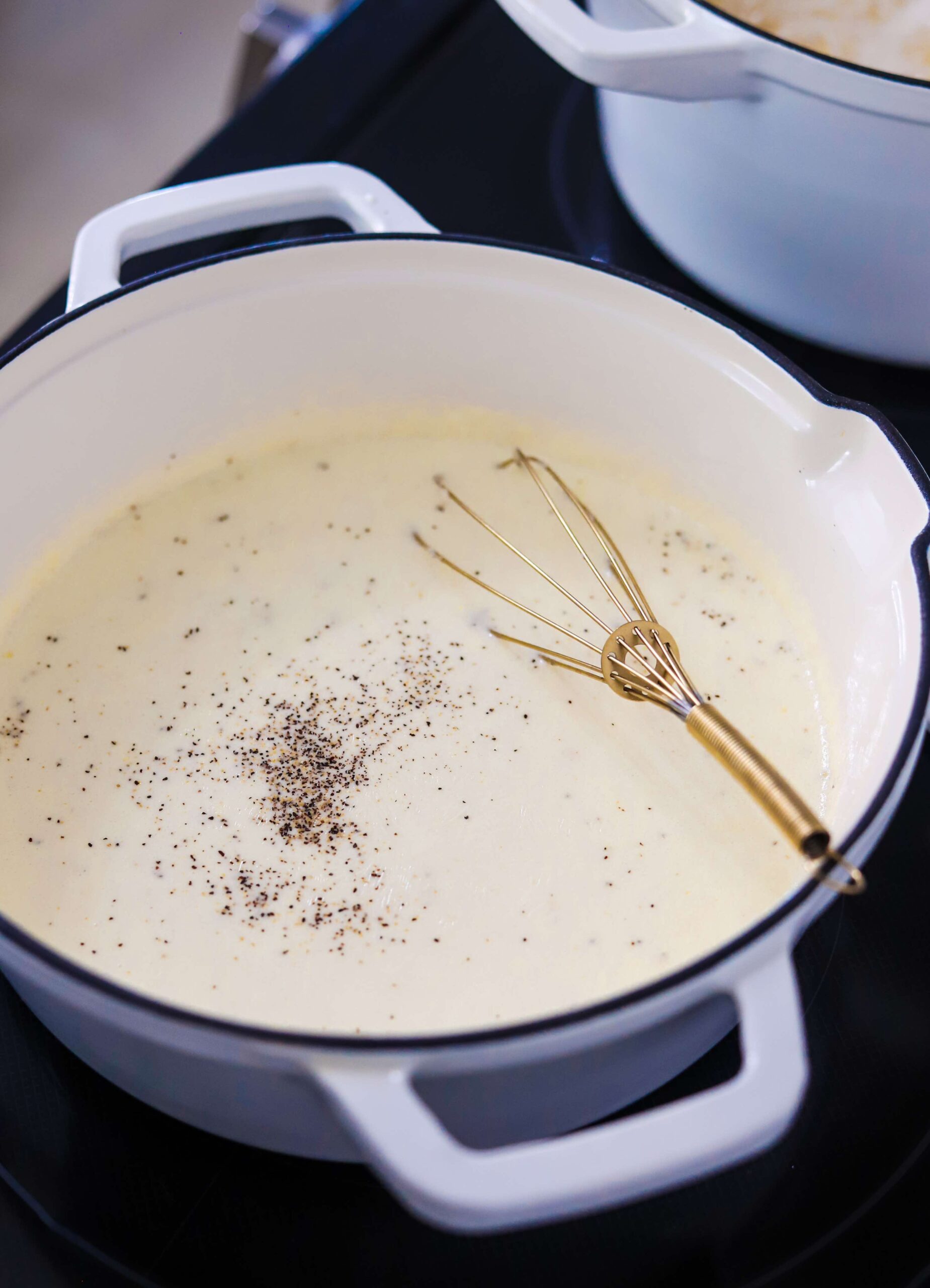 - Whisk in 1 1/2 cups of whole milk and 1 1/2 cups of heavy cream and season with a teaspoon of salt, 1/4 teaspoon of black pepper and the optional dijon mustard and hot sauce