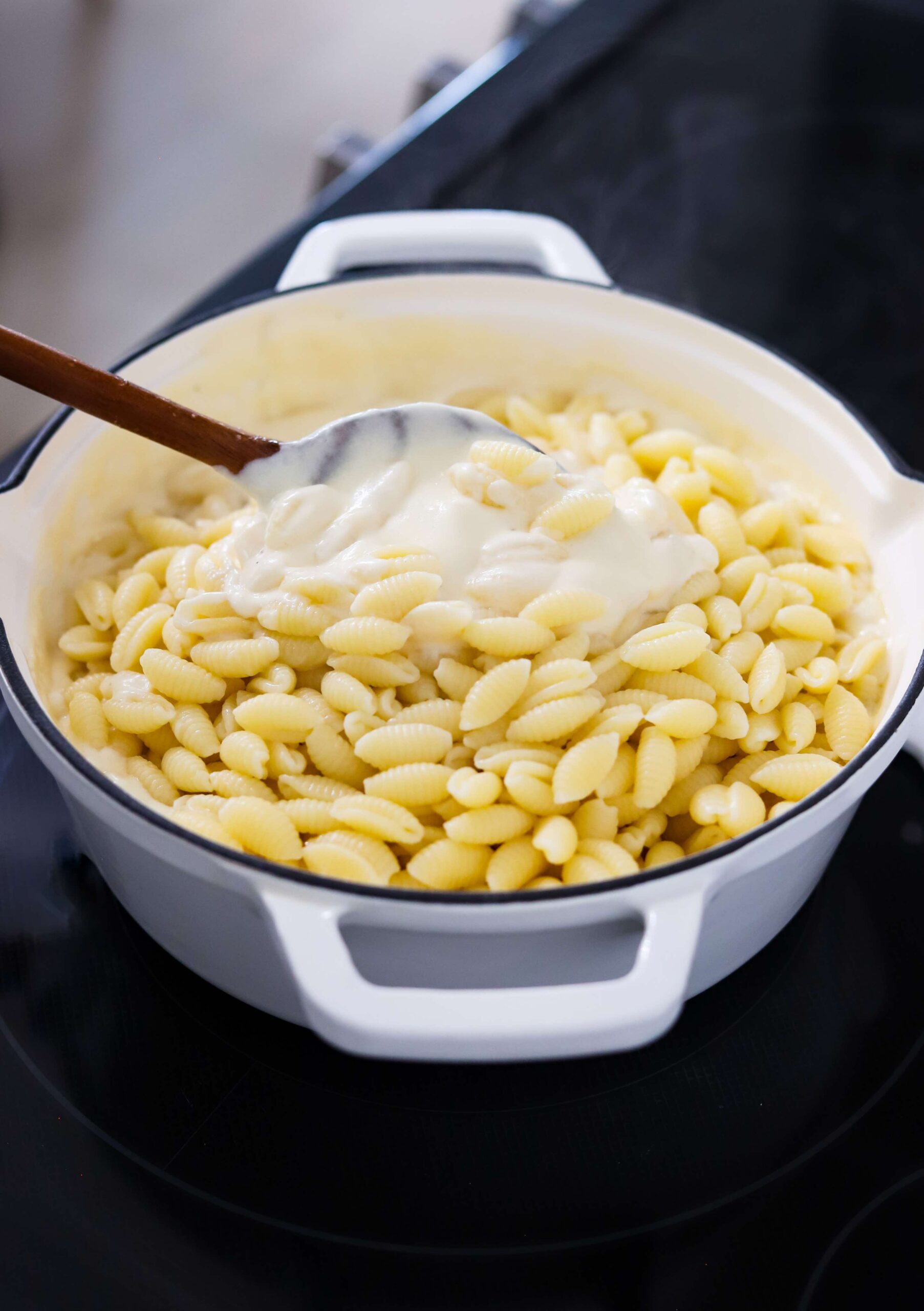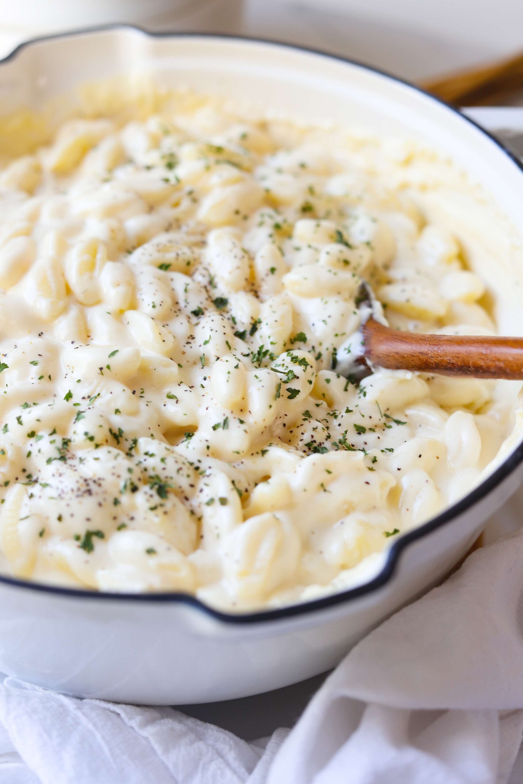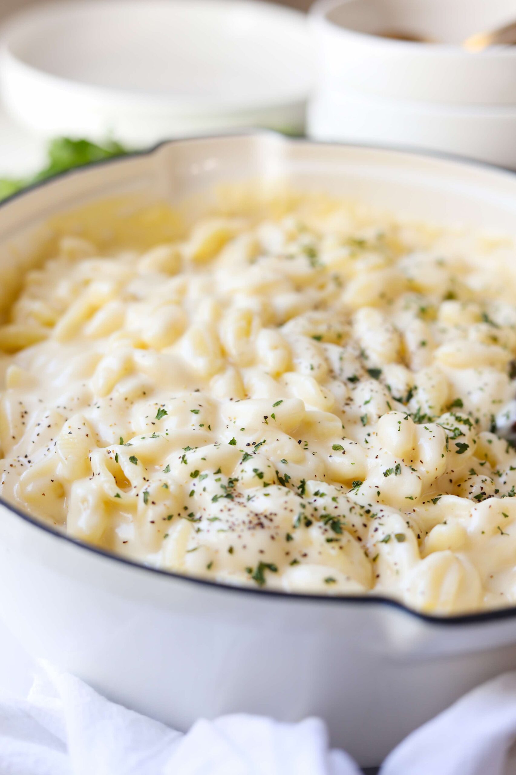 That extra creamy almost soupy feeling mac and cheese is what you’ll get as soon as the pasta has been stirred in. While everything is still extra hot and freshly combined. This is my favorite mac and cheese situation, but if you prefer that thicker consistency where the cheese sauce sticks directly to the pasta and nothing drips back into the bowl then you just need to let the mac and cheese rest until things begin to cool down a bit.
