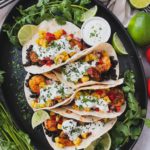 Make the cilantro lime crema by combining 2/3 cup mexican crema, 2 tablespoons finely chopped fresh cilantro, 1 tablespoon freshly squeezed lime juice, 1/4 teaspoon garlic powder, 1/8 teaspoon salt and some lime zest