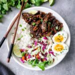 A rice bowl perfect for leftover beef bulgogi with a tangy slaw, rice and soft boiled eggs.