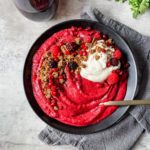 Combine 8 ounces of frozen blackberries, 6 ounces of fresh raspberries, 1 cup of fresh pomegranate arils and 1/2 cup of vanilla Greek yogurt in a blender or food processorÂ