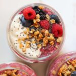 Layers of a thick and creamy berry chia pudding with greek yogurt, fresh. berries and granola.