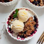 Bake in a 375 degree oven for 20-25 minutes (4” individual dishes) or 30-35 minutes (8” pie dish) or until the crumble is golden brown and the fruit is bubbly