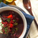 Garnish each bowl of borscht with a scoop of sour cream or greek yogurt and a few extra dill fronds
