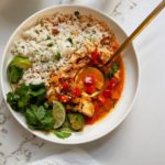 Simmer for 3-5 minutes and add the diced tomato and 14 ounce can of coconut milk. Stir to combine.