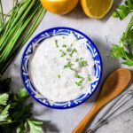 Combine 1/3 cup of plain greek yogurt, 1/3 cup of sour cream, 1/3 cup of mayonnaise, 1 teaspoon of fresh lemon juice, 1 finely grated clove of garlic, 1 tablespoon of finely chopped fresh chives, 1 tablespoon of finely chopped fresh parsley, 2 teaspoons of dried dill, 1/2 teaspoon of onion powder, a pinch of salt and black pepper and an optional pinch of paprika or dry mustard in a bowl