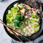 Assemble the bowls by dividing the sticky rice between 2 shallow bowls and adding the flaked crab, ribbons of cucumber, sliced avocado, wakame and several strips of nori