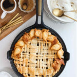 A classic apple pie baked over a caramel base in your favorite cast iron skillet.