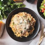 Once the sauce thickens a bit, add the cooked pasta, shredded chicken, 1/2 cup of finely shredded parmesan, some black pepper and parsley and toss to combine