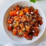 Transfer the butter and brown sugar coated butternut squash cubes onto a parchment lined baking sheet