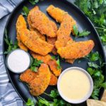 Crush 4 ounces of pork rinds into a fine breadcrumb like texture and combine with 1/2 cup of grated parmesan, 1 teaspoon of seasoned salt, 1 teaspoon of tajin, 1 teaspoon of onion powder, 1 teaspoon of garlic powder and 1 teaspoon of dried parsley in a wide shallow bowl and set aside for now