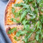 Transfer the pizza to a cutting board, top with arugula and additional shredded parmesan and slice into wedges
