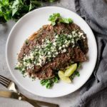 While the sauce is simmering, thinly slice the chicken breast, crumble the queso fresco and finely chop the cilantro