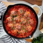 While the meatballs are baking, add 4 cups of tomato sauce or marinara into a large skillet and gently warm over medium low heat