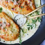 Add 1 cup of chicken stock, 1 cup of heavy cream, 2 tablespoons of freshly squeezed lemon juice and a teaspoon of lemon zest to the skillet and bring to a simmer