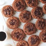 Transfer the baking sheet onto a cooling rack and immediately press a few chunks of dark chocolate over each hot cookie and sprinkle with sea salt