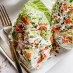 Drizzle each wedge with dressing and top with crumbled bacon or prosciutto, quartered tomatoes and shredded cheese