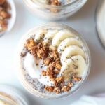 A thick, creamy chia pudding with bananas, greek yogurt and granola.