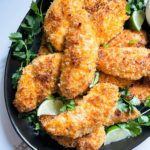 Transfer the egg coated tenders one at a time into the coconut panko breading and once they are generously coated on all sides, transfer the tenders onto a parchment lined baking sheet.