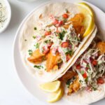 Once the oil is between 350°-375°, dip a piece of cod into the chilled batter until all sides are coated