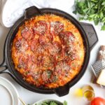 Cover the entire surface of the dough lightly with finely shredded mozzarella or parmesan and then add your other toppings