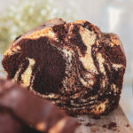 Using a large cookie dough scoop or 1/2 cup measuring cup, add the batter into your prepared loaf pan alternating between the vanilla and chocolate until all of the batter has been added