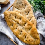 When the dough is done with the second rest, brush the top surface with olive oil and sprinkle lightly with finely shredded parmesan, dried herbs and flaky sea salt
