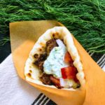 Assemble your gyros by placing slices of meat on a piece of flatbread and topping with tzatziki, onions and tomatoes