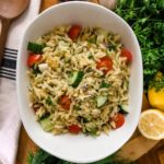 Drain the cooked orzo and then transfer into the large bowl containing the olive oil and lemon juice dressing